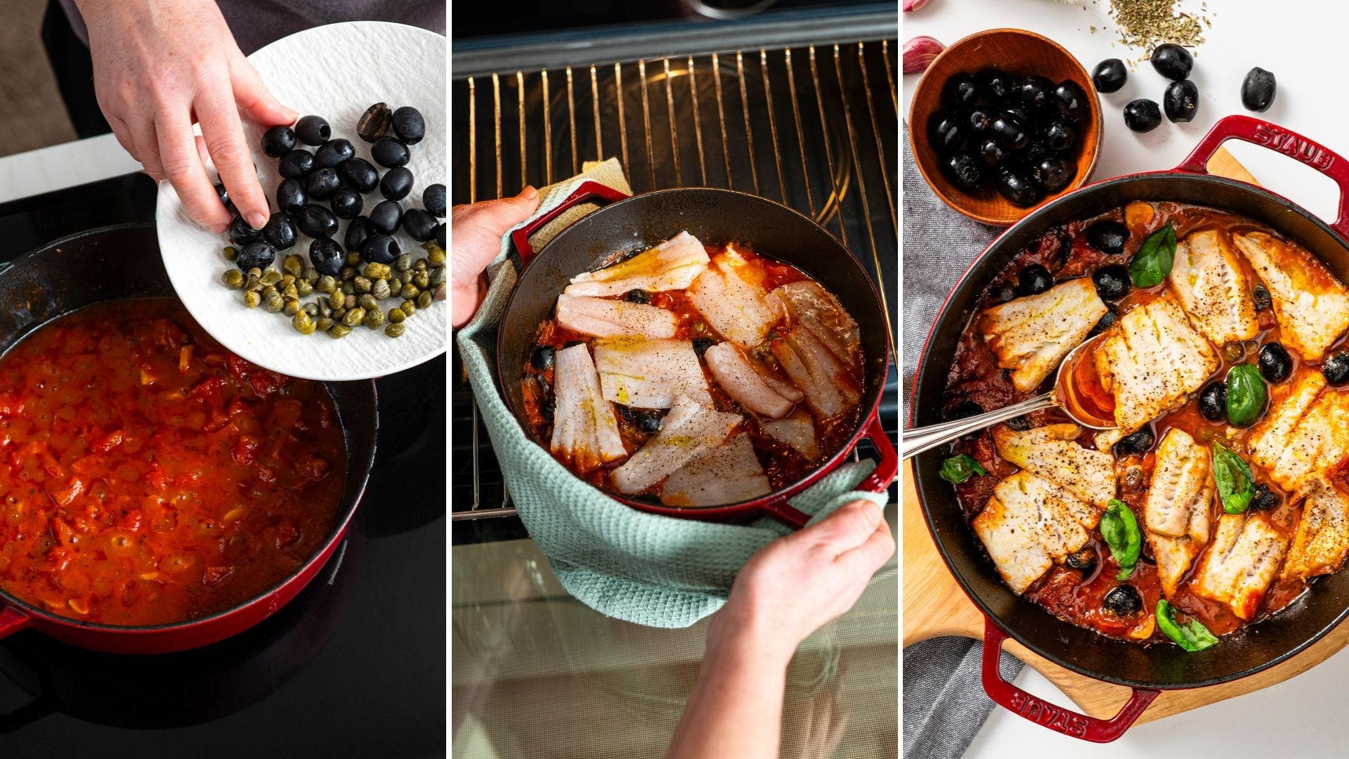 - Do základu přidejte drcená rajčata, oregano, tymián a dochuťte solí. Omáčku 10 minut povařte a mezitím si rozehřejte troubu na 200 stupňů. Po deseti minutách do omáčky přidejte olivy, kapary a osolené kousky tresky.